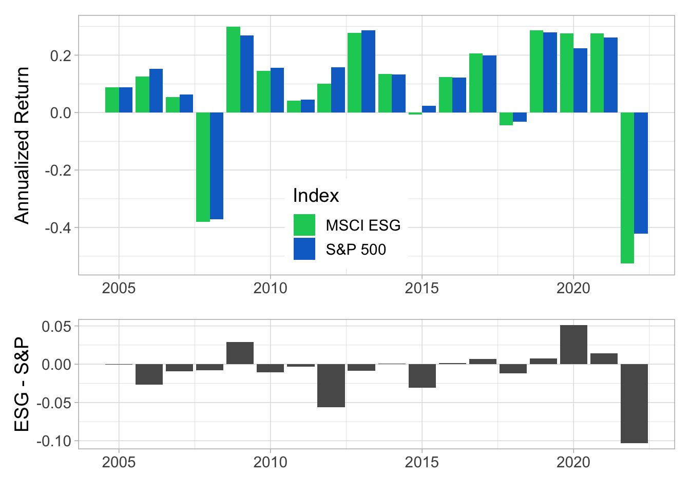 FIGURE 4.4: Annual returns. In the upper panel, we plot the average daily returns multiplied by 252, on a year-by-year basis. The lower panel shows the difference between the two indices (MSCI ESG minus S&P 500).